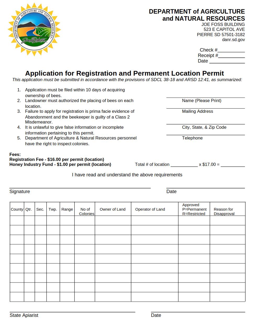 Right-click the apiary permit form below and select "Open Image in New Tab" then click the new tab to show the form. From your browser's File menu select "Print" to print the form to fill out. When you are done, mail it to:
