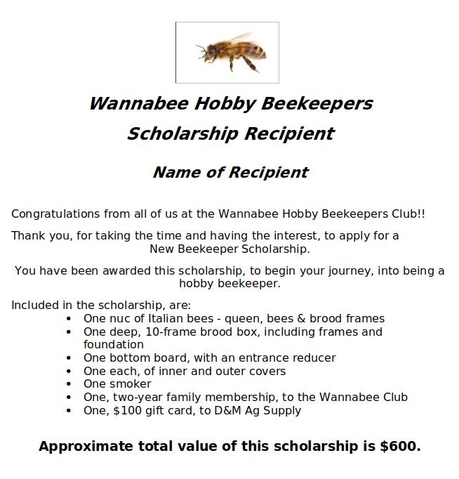 One of the primary missions of the Wannabee Hobby Beekeepers Club is to promote beekeeping to the Black Hills youth, and adult educators who have programs to introduce the youth to beekeeping. The Club funds up to three, yearly scholarships, primarily for the purchase of bees, to help fund the apiary of aspiring beekeepers. The Club periodically receives donations of bee equipment, and may decide to distribute items to applicants or past scholarship winners, depending on experience, and need. with at least one Board member. • The Secretary of the Club, will solicit scholarship applications through the Club members, local youth clubs and via social media. • Applications will be due by the third week of February, and may be mailed to: ◦ Resa Combs ◦ 8040 Bighorn Rd ◦ Rapid City, SD 57702 • The Scholarship Committee will review the applications and announce the scholarship recipients, during the March meeting. • Scholarship recipients will be ineligible for another scholarship, for two years, immediately after the year the scholarship was awarded. • Members of the Scholarship Committee will be available, for assistance/consultation to scholarship recipients, throughout the year. 2025 Scholarship Committee Members: Dan Mulally - baldbaby2000@msn.com Resa Combs - rrcombs@gmail.com Jerry Owens - adrbees@gmail.com Joan Clements - jrbeagle03@me.com Wannabee Applicant Responsibilities • Applicants must complete a Scholarship Application Form (below). • Applications will be due by the third week of February, and may be mailed to: Resa Combs, 717 South St., Rapid City, SD 57701. • Scholarship recipients must attend at least three meetings, per year, preferably between June and October. • It is recommended that the scholarship recipient keep a written journal of their experiences, including observations during hive inspections. These journals will be helpful, in discussing questions or issues, with mentors or other beekeepers. • Scholarship recipients will give informal updates, on their apiary, during Club meetings. In addition, they will give a year-end presentation, on their experiences. • If the scholarship recipient chooses to not keep bees, after their first year, returning the equipment to the Club, would be appreciated. • Scholarship recipients will be ineligible for another scholarship, for two years, immediately after the year the scholarship was awarded. • Members of the Scholarship Committee will be available, for assistance/consultation to scholarship recipients, throughout the year. The Wannabee Hobby Beekeepers meetings are held on the 2nd Wednesday of each month, beginning at 6:00pm. The location of the meetings is: SD Dept. of Fish and Game Outdoor Campus - West 4130 Adventure Trail (off of Sturgis Road) Rapid City, SD 57702 You may also find us on Facebook, as "WannaBee Club". Wannabee Hobby Beekeepers Scholarship Application Name________________________________________________________ Age_____________ Address_________________________________________________________________ City___________________________________________ State____ Zip Code_________ Name of Parent_________________________________________________________________ Parent's Phone_________________________________________________________________ Parent's Email_________________________________________________________________ Write a brief paragraph, on why you are interested in honeybees and beekeeping. What do you hope to accomplish, if you are chosen for this scholarship? Please attach a new sheet of paper, if needed.