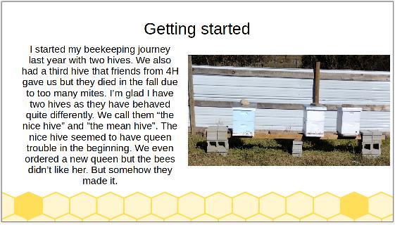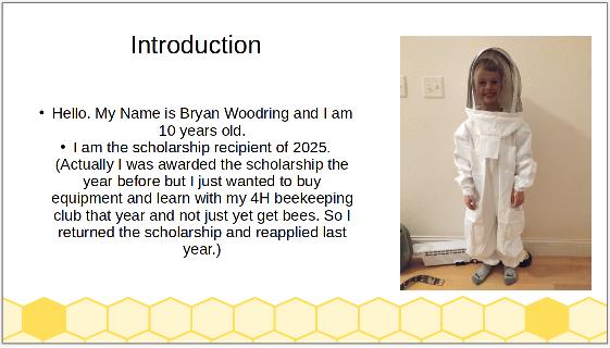 Wannabees 2025 Scholarship Award Winner The Wannabees is proud to sponsor 2025's scholarship award to Bryan Woodring of Rapid City, South Dakota! Bryan's youthful enthusiasm for bees and beekeeping was a real hit with the Wannabee's scholarship committee and assembled audience at our March meeting. At that meeting, he presented a slide presentation his family put together that was an excellent summary of his hive care and his learned knowledge. We present them here for your appreciation - congratulations Bryan on a job well done and welcome to the world of hobby beekeeping!